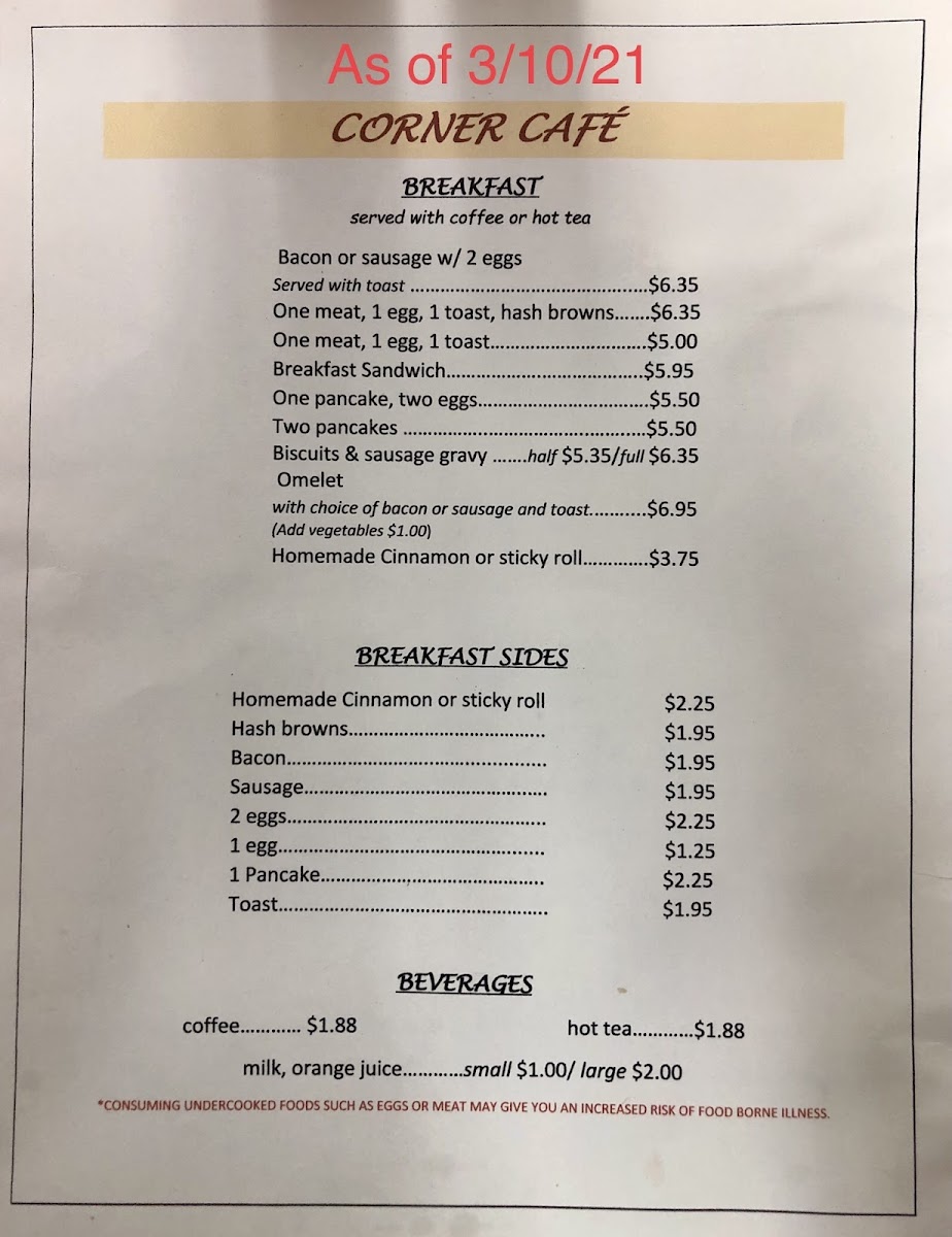 From a reviewer’s perspective, the menu at Arcadia Cafe stays true to classic American breakfast comfort. Standout morning options include the hearty Bacon Or Sausage W/ 2 Eggs, Hash Browns, and Toast and the simpler but satisfying One Meat, 1 Egg, 1 Toast, both showcasing generous portions and homestyle flavors. For a quick bite, the Breakfast Sandwich and One Pancake, Two Eggs offer convenience without skimping on taste, and the breakfast sides such as Homemade Cinnamon Or Sticky Roll, Hash Browns, and Bacon/Sausage add excellent value. Beverage choices like Coffee and Hot Tea round out the menu, making it a cozy spot for locals and travelers alike seeking a familiar, unpretentious breakfast at attractive prices (menu details reflect typical small‑town diner affordability).